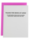 Details:• Letterpress printed on tree-free paper• Black ink with bright orange envelope• Size: 5.5” x 4.25”• Folded card, blank inside• Sealed in a cello sleeve• Made in California